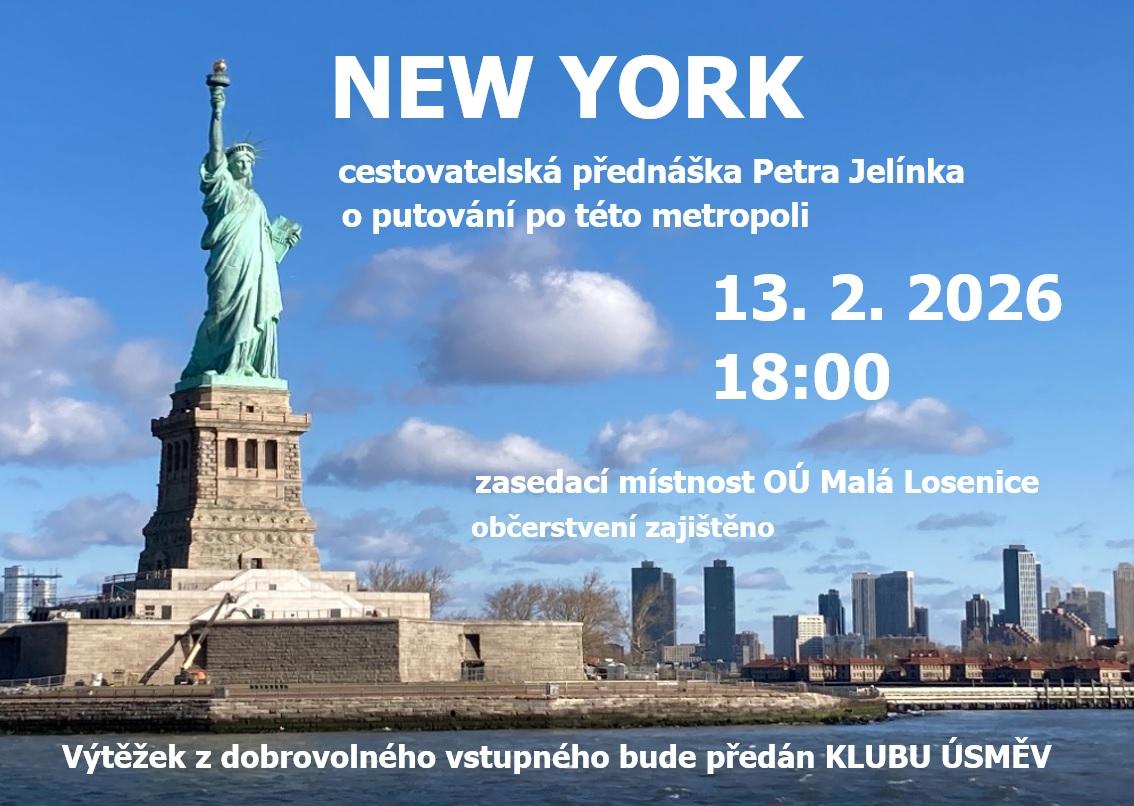 Dne 13. 2. 2026 se bude konat v Malé Losenici další cestovatelská přednáška nám již dobře známého Petra Jelínka. Tentokrát z jeho návštěvy NEW YORKU.