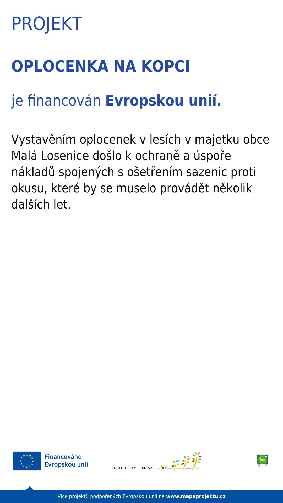 Stručný popis projektu: Projekt je zaměřen na výstavbu oplocenek v lesích v majetku obce Malá Losenice, kde vlivem kůrovcové kalamity došlo k vykácení velkých ploch porostů. Následně se tyto plochy osázely novými sazenicemi. Tímto se zamezí následnému okusu sazenic lesní zvěří. Cíl projektu: Vystavěním oplocenky se zabránilo okusu sazenic lesní zvěří, která se v dané lokalitě hojně pohybuje. Tímto se uspoří náklady spojené s ošetřením sazenic proti okusu. Výsledek projektu: Výroba a zapuštění dřevěných kůlů do země, na které se poté osadilo drátěné pletivo v celkové délce 700 bm.
