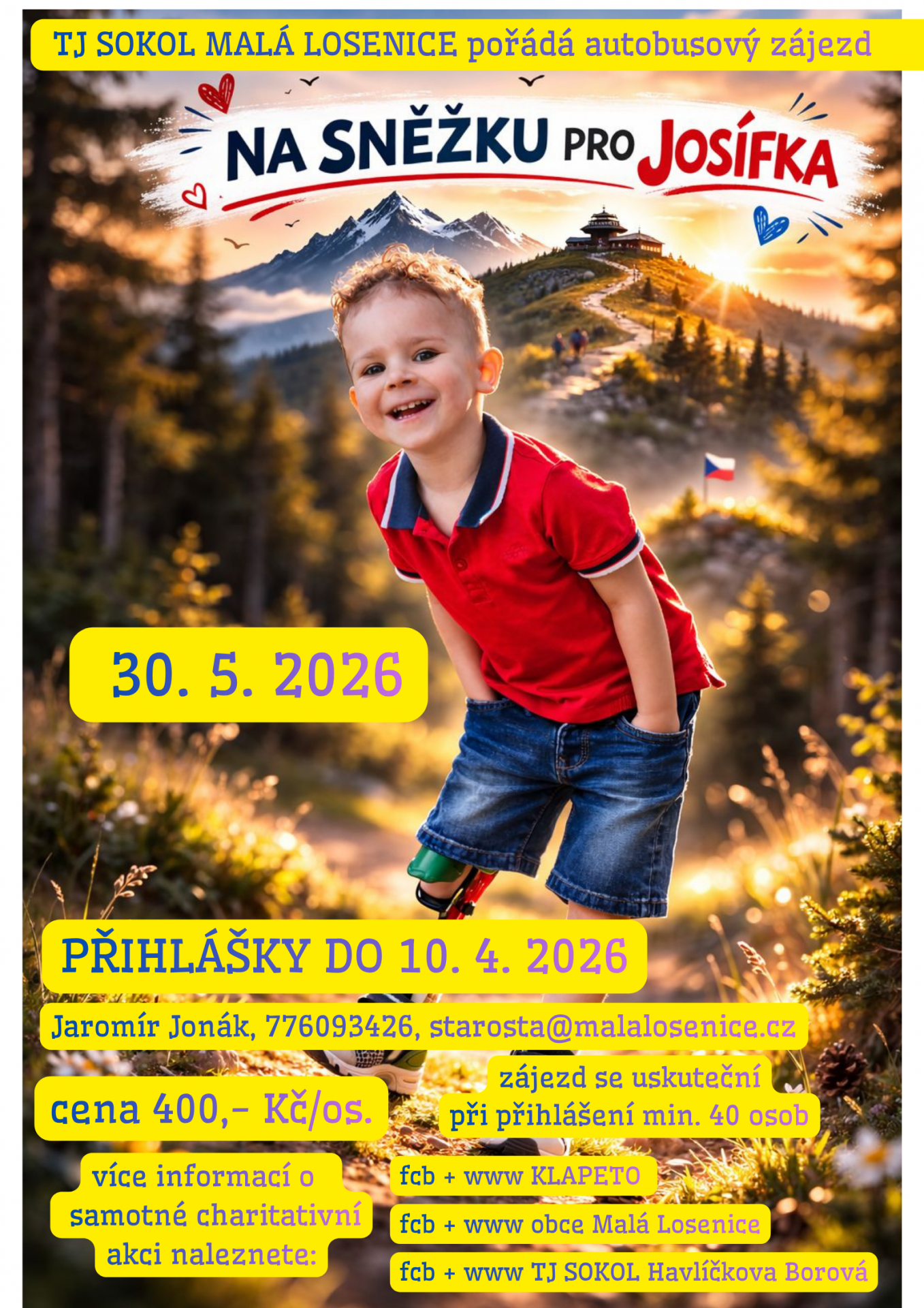 V sobotu 30. května se uskuteční již 14. ročník charitativního výstupu na Sněžku, jehož tváří se pro letošní rok stává čtyřletý Josífek Šidlák, chlapec se vzácnou vrozenou vývojovou vadou dolní končetiny.