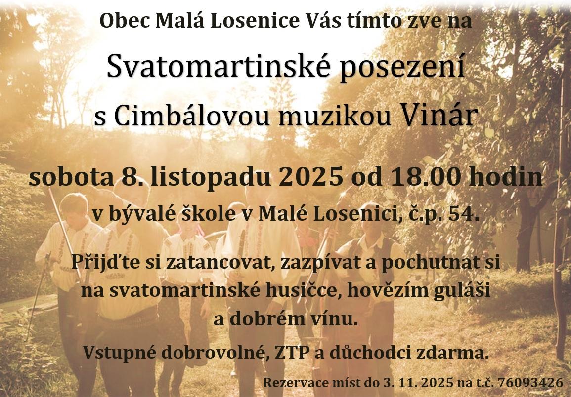 Přijďte si zatancovat, zazpívat a pochutnat si na svatomartinské husičce, hovězím guláši a dobrém vínu. Vstupné dobrovolné, ZTP a důchodci zdarma. Rezervace míst do 3. 11. 2025 na t.č. 76093426